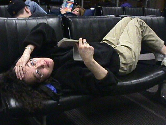 Portland Airport prior to our 11:50pm, Wednesday night flight. When you travel, you don't want to spend valuable sight seeing time sitting on an airplane. Keely knows to make the best use of nearly empty seats while waiting for the plane to board.