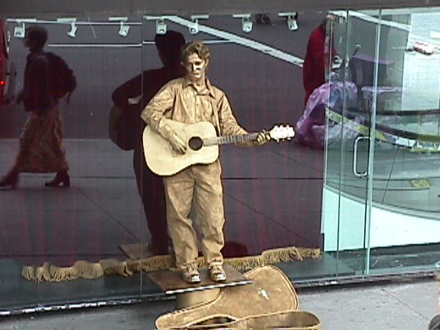 This man might have been economically challenged as well, but he had enough money for gold paint and a guitar.