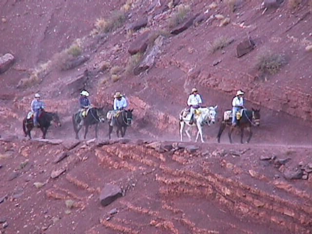 Our first view of the mules. We could sure smell them on the way down. The trail is littered with mule poop, but the worst parts were the places still muddy from the GALLONS of mule urine excreted at least the day before. We decided either a mule can hold one heck of a lot of liquid, or when the first mule goes, it sets off a chain reaction in the others. However it happens, if mule piss was rose water, the Grand Canyon would smell like a garden. It isn't and it doesn't. Unless you have a pee garden, I suppose. |