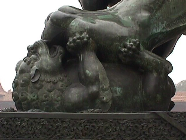 The baby lion is said to be suckling from the female's claws, drawing sustenance from her power or something. If baby lions are anything like Schnauzer puppies, it is just biting whatever is nearest its mouth.