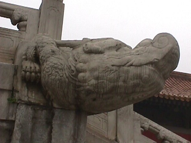 Roger Moore, the voice on the tape, told us there were 1100 of these dragon-shaped downspouts inside the Forbidden City. Must be quite a show when it rains. (Space: Men like big things, so the buildings and courtyards start out HUGE at the southern end. Women seem to like little things, to the buildings and courtyards get smaller, down to near closets at the northern end) |