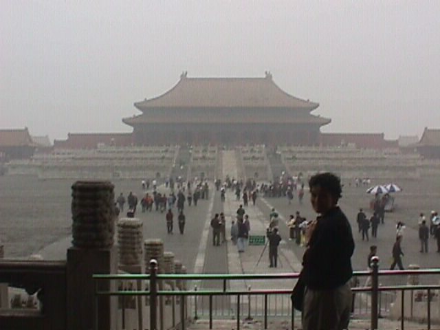 This looks from the Gate of Supreme Harmony northwards to the Hall of Supreme Harmony - Tian He Dian. Again, notice the huge courtyard. My book gives goofy measurements, like the city is 7550m wide by 960m long, but that isn't true because it is longer than wide. The book also says 7550m is 2460ft, and I don't have any idea where they got that number. |