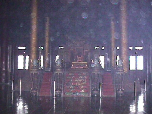 Sorry for the poor quality. Throne in the central space in the Hall of Supreme Harmony. This is sort of the time recording place for the empire. The emperor marked winter solstice, lunar New Year, and received congratulations on his birthday here. The ability of a good ruler to keep good order was demonstrated by his ability to regulate the seasons. |