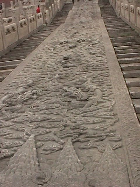This is the Nine Dragon Screen, a monstrous block of rock said to weigh 250 tons. It features a motif of dragons playing in foamy waves beyond mountains.