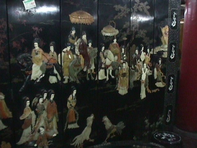 Inside the gatehouse is a showroom for lots of big, expensive things, like life-sized Terracotta Warriors and these lacquer screens inset with carved agate. This one was about 6' x 6' and cost roughly $4000.