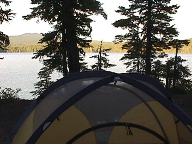 This campsite was perfect. We followed a band of otters playing in the water until they disappeared near here. The ground was flat, there was a fire ring complete with some wood, the undergrowth was nothing but ripe huckleberries. And there was no one around for at least a half mile in any direction. |
