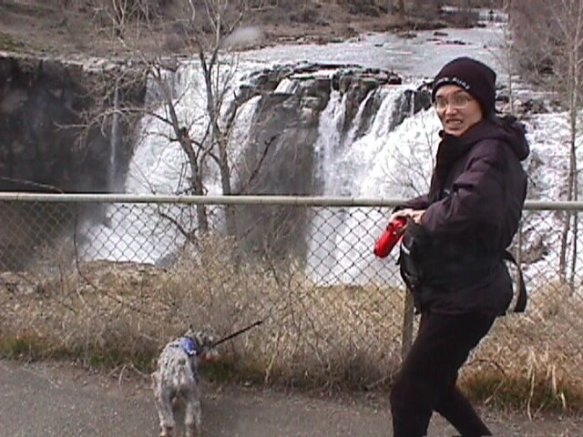 The falls are about 40 feet high and pretty spectacular. Be-Bop gets kept on the leash quite a bit because he is just getting to experience the great outdoors. He is Boadicea's father and is a stud dog. Keely and I rescued him from that heinous lifestyle. |
