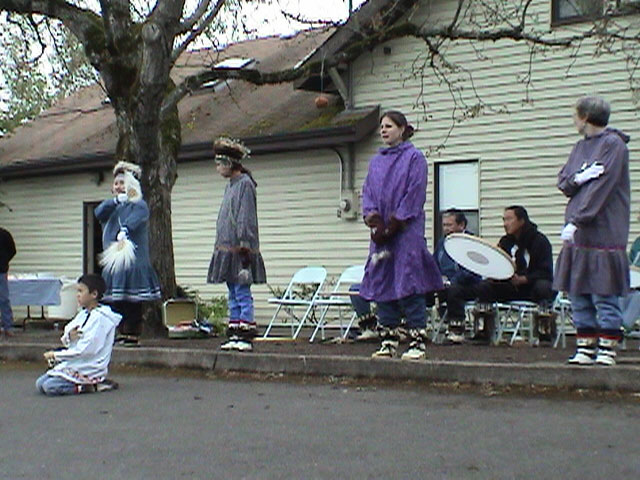 Part of the day's festivities was a visit from the King Island Dancers. Here are the women (standing) and the boy (kneeling) performing the Eskimo Ice Cream dance.