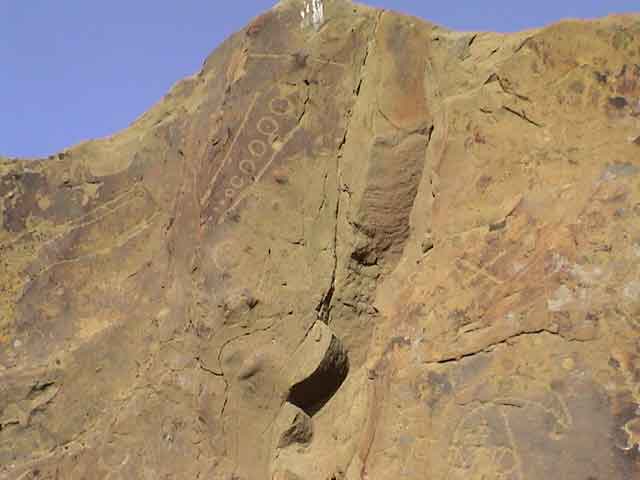 Puebloans were big into astronomy, a skill probably imported from Mexico (along with corn and pottery). This petroglyph is possibly some form of a calendar. There were also Ute carvings on the rocks, identified by the presence of horses which were introduced in the 1500s. The Utes are transplants, they did not arrive in this location until 1880. |