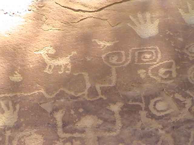 It starts here, in the square spiral. That is the sipapu where the Hopis emerged into this world. They then started on their migration. There, above and to the left of the next spiral you see a small glyph of a winged creature symbolizing the where the Eagle clan split off from the group. Following the path, you see where the Mountain Sheep clan split off. |