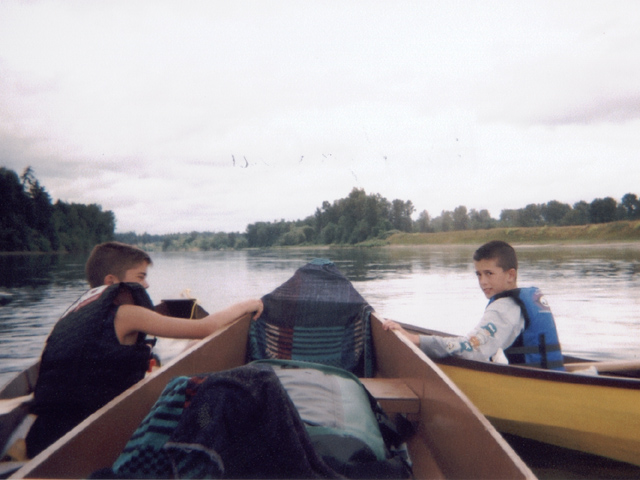 Much of my paddling time was spent with the boys attached to my canoe like lampreys. They would paddle up, apparently exhausted and I would let them grab on. I had tried towing, but they liked to tug on the line and bash into each other. I wanted them up in front so I could wallop them with the paddle when their hijinks got to be too much for me to handle (about every 90 seconds or so). |