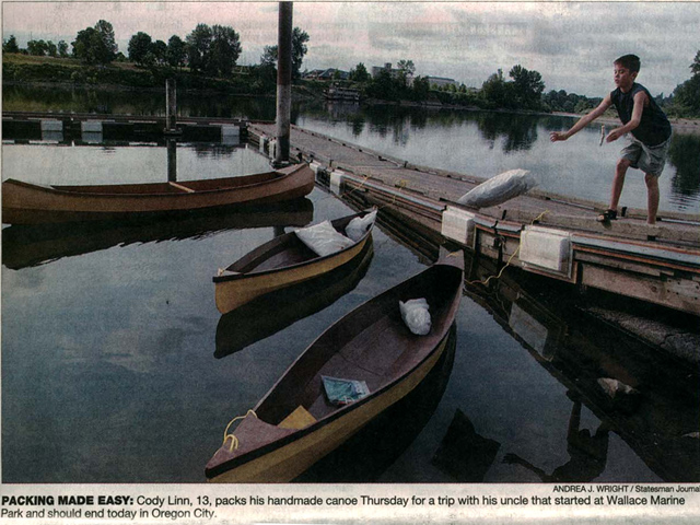 This 7x5 pic was on the front of the Local section - Cody tossing a pillow into a canoe. The boys had been in a canoe before, but never the captain of their own craft.