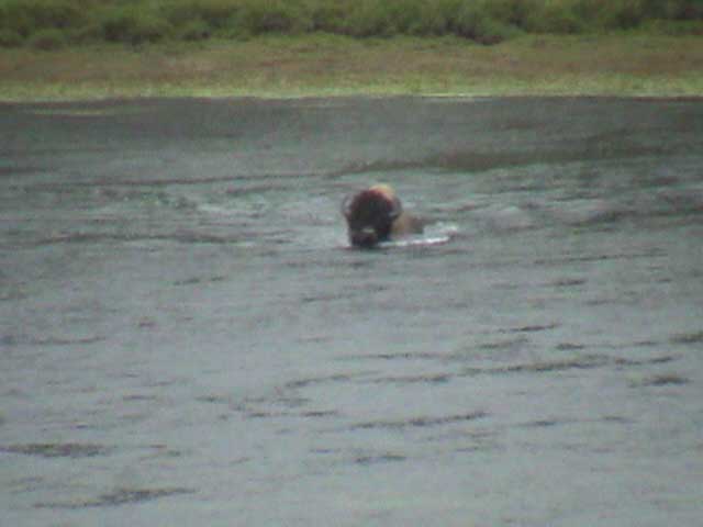 As we traveled along the road, things started becoming surreal. I noticed a buffalo on the other side of the river and Keely said "He is coming across." Sure enough, when you are a 2000 pound buffalo, you can pretty much do what you want, including cross a river. |