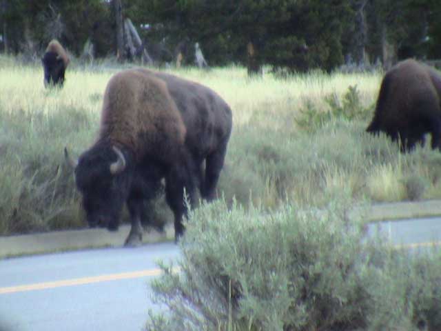 We were entranced. Bison! Real buffalo! Standing right there on the road. I kid you not, this was just like seeing whales or dolphins, and I expect I would feel the same seeing a dinosaur.