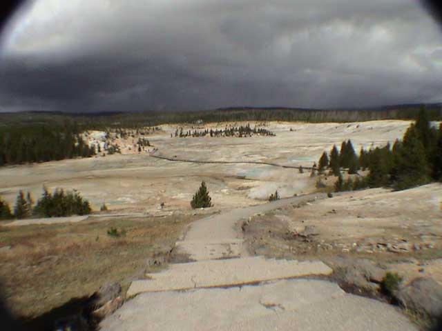 From the Canyon Area, we drove to Norris Basin. At the Visitor's Center we saw our first park ranger. She was answering questions at a counter that was open to the weather and only lasted a few minutes in the wind and rain.