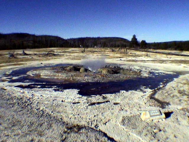 Whoops, I might have been wrong there. This is Jewel Geyser, that last one was Shell Geyser. Jewel erupt every few minutes, but it was being persnickety. I coerced a passing tourist to join me in "the geyser dance," but it did no good. Jewel just didn't want to blow. |