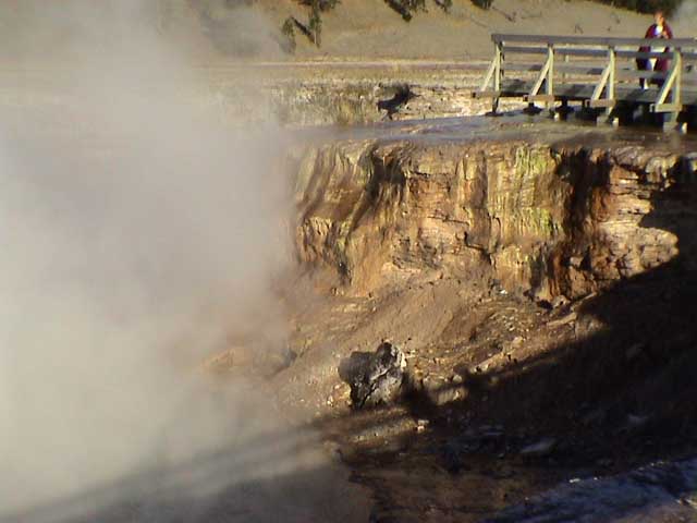 From Biscuit Basin, we went up to Grand Prism. We met a lady who said 20 years ago, this was all level with the boardwalk. Remember the travertine mounds at Mammoth? I was wondering where all that stuff comes from, there have to be big caves underground. This is an example of where that stuff comes from (it flows into the Firehole River from here). |