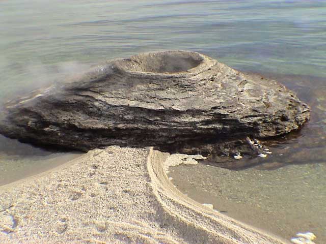 This is either Fishing Cone, Lakeshore, or Big Cone geyser. People were reputed to cook their fish in Fishing Cone. I had been musing about making a good old fashioned disaster movie set in Yellowstone. and those footprints in the sand made me think of one of the shots: The setting is that the entire cauldera is erupting. Right at the beginning, everything appears normal, and here we have someone I labeled Loud Mouthed Jerk (LMJ) ignoring the signs saying KEEP ON THE TRAIL and looking into Fishing Cone. Of course, the cone erupts, and LMJ's head is engulfed in superheated water. Go to close up of LMJ jumping up, his skin boiled off his face - eyeballs milky white like a cooked fish. Still alive, he runs screaming into the lake.
