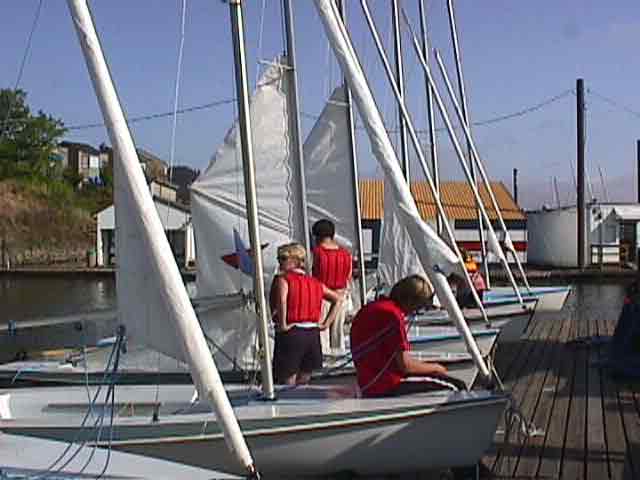 These pictures come from the last day of our 4 day (2 weekend) class. The young man in the foreground is Hugh, one of the instructors. He took the rest of the pictures you will be seeing. Hugh was the assistant instructor, Jordan was the instructor of record. They were 15 and 18 years old, respectively. This shot shows up rigging the boats for the day's sailing. |