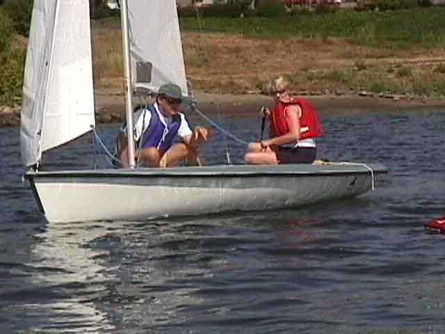 We had to learn both captain and crew positions, and here is Linda in control of our boat. She has a real good feel for the wind and we led the pack all day. Today was showoff day, and we were racing around a course - a mini regatta.