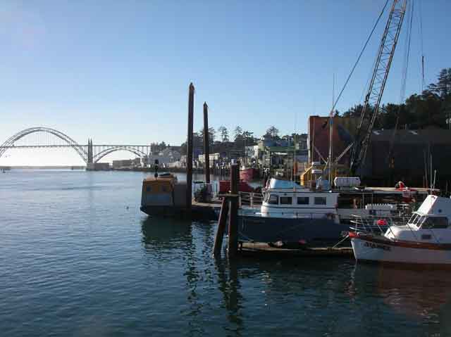 Yaquina Bay at Newport. Man, what a day. There was a fine wind blowing from the east the sky looked like it was made from crystal. That blue fishing boat in the foreground is the Miss Raven. Keely and I rode on her during a Festival of Lights contest a few years ago and that was the first year the owner won first prize. |