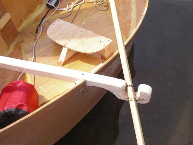 The steeringboard it pretty much just a claw that cups the paddle so I can move it back and forth with only one hand. I inset it into the gunwale because I thought it needed it. While it worked, it takes a lot more effort than a rudder and does not work as well. Also, the paddle likes to float, so you have to force it into the water. I used a small bungee cord to hold it in place. You can also see my moveable seat - another great idea that looked sensible on paper but just sucked in practice. It kept moving around and increased the frustration of sailing. |