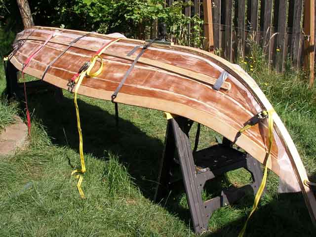 Once the joints had cured, I very carefully placed the 19ft long strips onto the canoe. I had wax paper between the canoe and the keel, then glued each strip together, finally clamping the whole assembly using ratcheting tie-downs to apply pressure. I let it cure over night. |