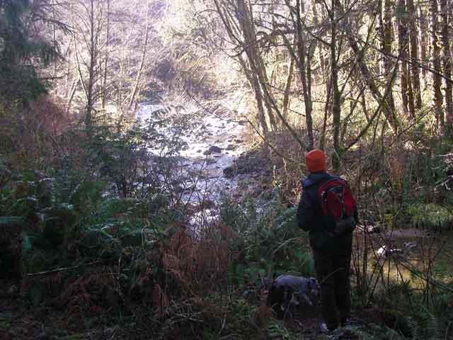 We finally got to the trailhead - a little east of Mapleton - and stepped out into a beautiful, wondrous Oregon winter day. Clear and bright, temps in the mid 40s. It almost made me forget the ignominy of being soaked in dog vomit from crotch to ankle. |