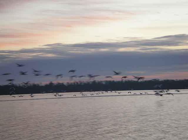 Low light and lots of fast moving targets do not make for good pictures. It is cool watching the birds take off in the morning - it happens in 2 large waves. The first wave is made up of the birds sitting on the tops of the trees, then, about 5 minutes later, a second wave of birds that had been sleeping inside the branches takes off. |