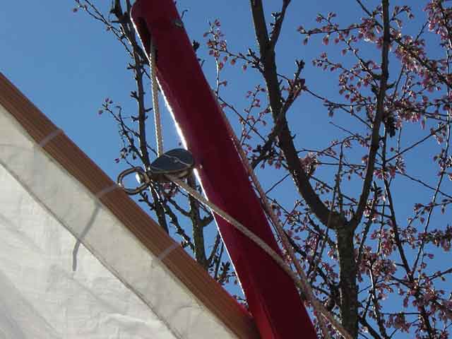 I followed the rigging plan for the Goat Island Skiff. The halyard is tied off to the front end of the yard, goes around the mast, and to a block (pully) at the center of the yard. It goes from the block up to the sheave at the top of the mast, then down to the cockpit. This arrangement, the halyard holds the yard tight to the mast when the sail is up. |