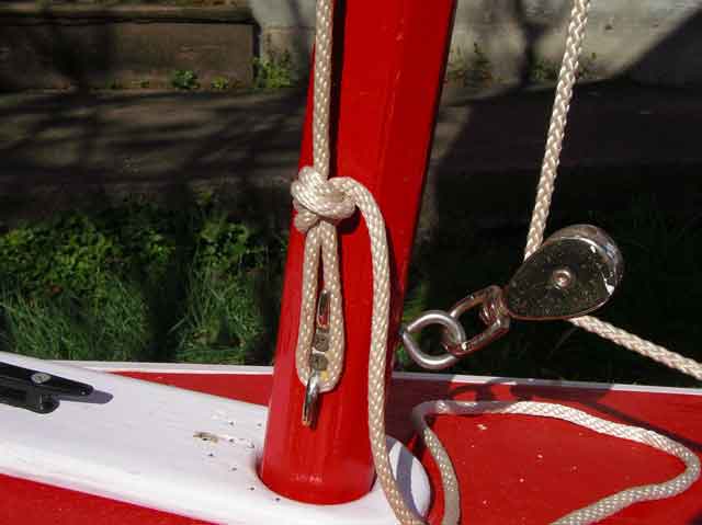 It is called a downhaul because it is hooked to a cleat at the bottom of the mast - it pulls the boom down. I have it adjusted so the boom will swing just over my head as it goes from side to side. I don't like getting 'boomed.'