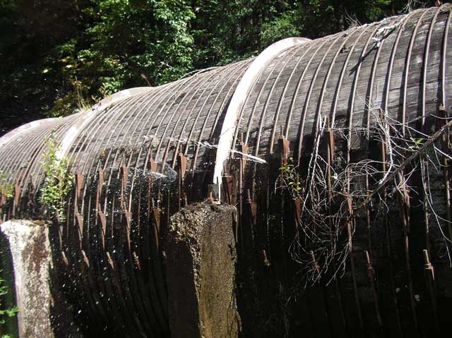 Our first stop was Toketee Falls. They divert a bunch of water through this 8ft high pipe to drive a hydroelectric generator. As shocking as it may sound: it appears people shoot at or otherwise damage this pipe. Just a few feet past the parking lot, there are no holes. On the side facing the parking lot - holes. |