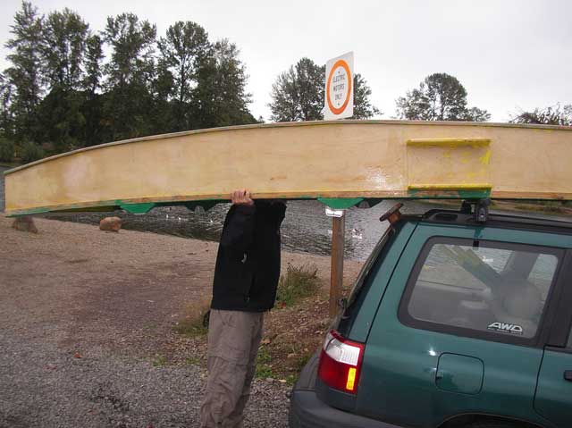 This boat tips the scales at 102lbs - empty and no sails or rigging. 100lbs is not real comfortable to be lugging around. Still, I'd rather carry it than buy and haul a trailer.