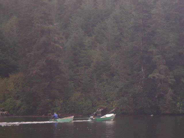 That's what we call a Coot Convoy. Dan standing in his boat (Dan always stands, I have never asked why) tending to his 1957 Evinrude and towing Greg's imaginatively named Green Skiff while Greg sits in a lawn chair and his dog, Tiller, scampers about. |