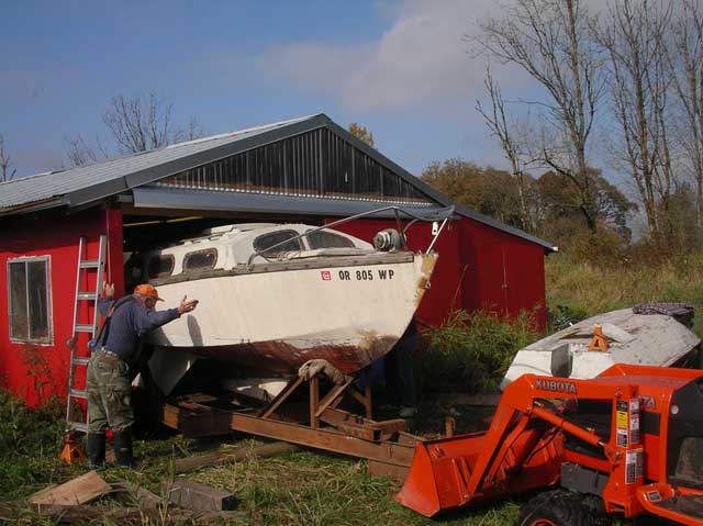 Greg used the tractor to push the boat into the barn while the guys shuffled rollers.