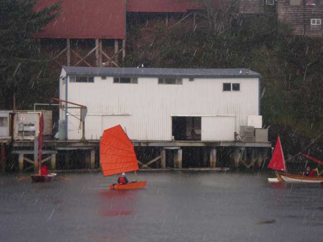 Rain (hail) or shine, we had a schedule to keep. I took 15 minutes to train Chris, the kid I had given my Harley 8 to last year, how to sail and turned him loose. I went back to the docks and got some pictures of my boat under sail.