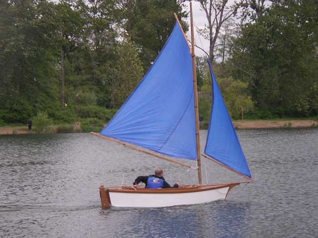 Then it was my turn and she sailed WONDERFULLY. I had a couple of runs where I was going like a seal chased by Great Whites. The sails worked perfectly and she was just a great little plaything. We need to work on the tiller ergonomics and there are some other tweaks to make her more user friendly, but she is a damn fine little boat. |