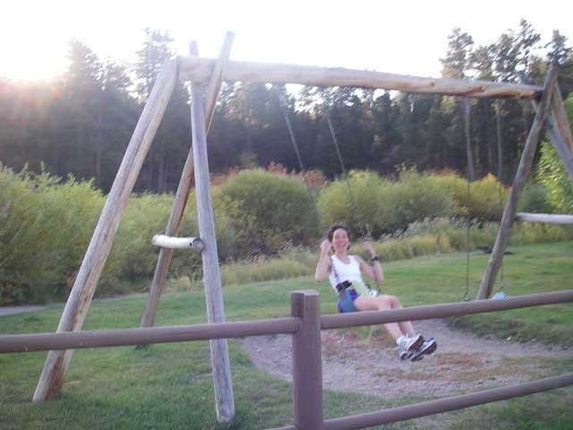 We ran through a KOA campground and while I was slogging along, Keely trotted out ahead and took a swing break.