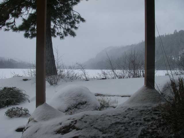 This was the view from our table - out over the lake and into the distant fog.