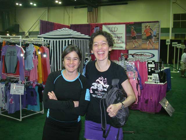 | We were rushed to go to the registration center to get our half marathon packets - Keely only had about 45 minutes to browse the expo. Here you see her next to Heather - Heather is smiling because she owns Atalanta Athletic Wear, makers of fine running skirts, and Keely is one of her biggest customers. | |