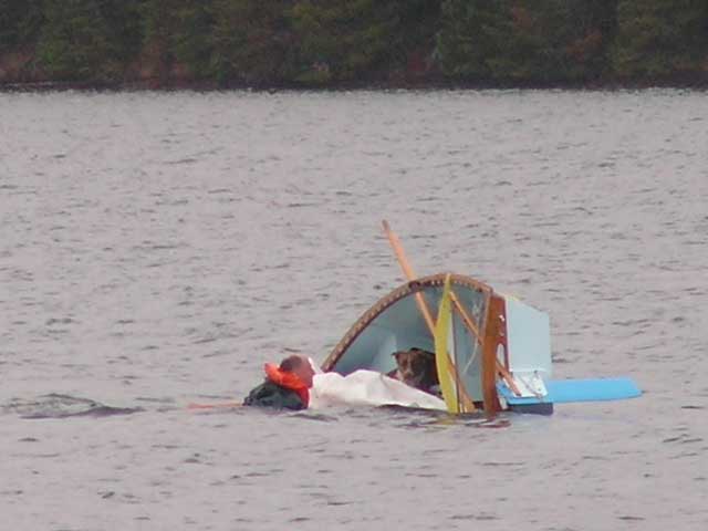 After this, things got, in my opinion, tragically comical. Morgan did not have a life jacket and immediately became Jerry's primary concern. Morgan struck out for shore and Jerry had to concentrate on rescuing the dog rather than himself. 2 Coot boats came to assistance and were able to fish both man and dog from the water, but they ended up unstepping the mast and towing the boat back to shore upside down.