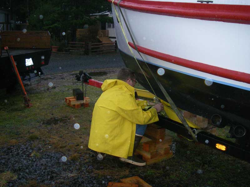 The trailer had been made for a 6,000# Bayliner, but Greg and Dan (mentioned earlier) did some welding on it and pronounced it 'acceptable.' We strapped the boat onto the trailer, hitched the trailer to Mike's honking big truck, and took off. The owner of the trailerpark where Titan had been staying was ecstatic - I've never seen a man happier to see a boat leave his property. |