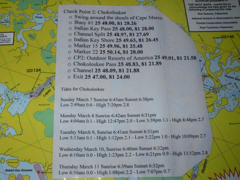 Besides laminating, drawing the route, and circling the important places with grease pencil, I printed up the key waypoints and five days of tides for each checkpoint. I then taped 'em to the maps with clear packing tape.