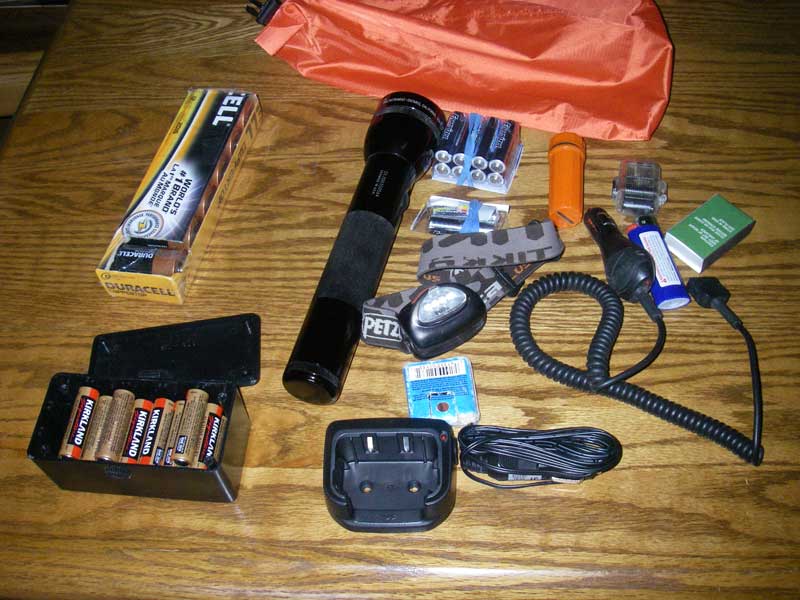 As navigator, it's my job to make sure I can read the GPS and charts, as well as search for channel markers. I have 3 changes of batteries for my very powerful, waterproof, LED flashlight, 3 changes of Litiium batteries for the GPS, 1 change of Lithium batteries for the SPOT, and 24 AA batteries that can be used for the VHF or GPS. I also have an LED headlamp with 2 changes of AAA batteries, and a 12V recharger for my cell phone (the boat has a 12V power supply.)