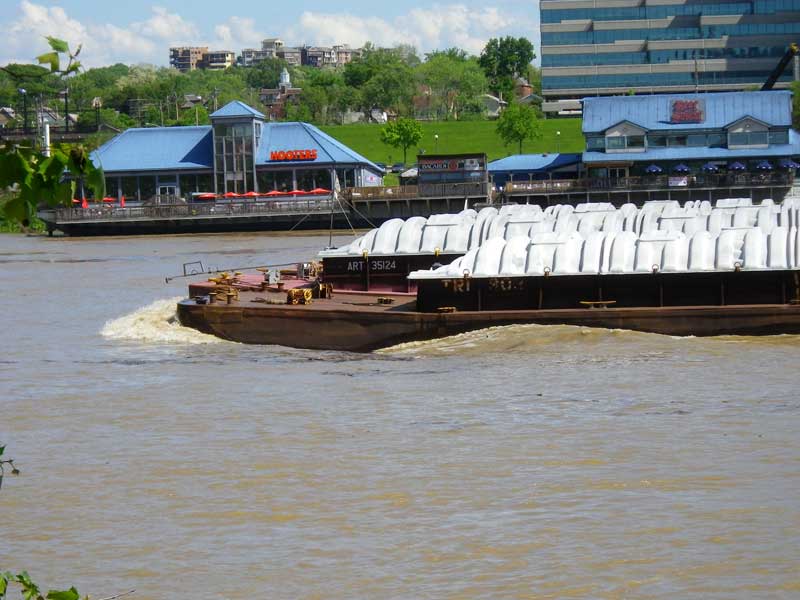 Every time I suggest sailing on one of the great rivers of America, people start screaming about the horrors of the barges and how they'll "grind your boat into paste." Well, as you can see from this bow wave, that is probably true. However, I think I am an astute enough sailor to be able to navigate around one of these monsters. While they are huge and scary, they are moving at a constant speed and are driven by professionals. It is incumbent on me to miss them, not the other way around. |