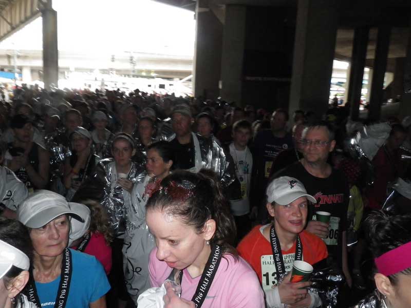 The mob after the finish line was pretty intense. 9,417 people ran the half and 4,109 ran the full, and we were all squeezed into this underpass for final processing (just like the pigs back in the days of Porkopolis!)
