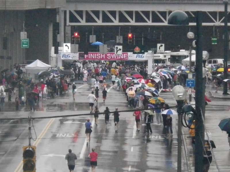 They were running the 5K event that morning. Cincinnati really embraces the "Flying Pig" idea, with pink motifs and even calling the end the 'finish swine.'