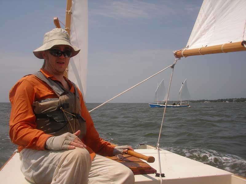 | This, my friends, is an outstanding picture. It shows Paul (organizer of the OBX130) at the helm of his father's Mikesboat, Ember's Watch. The winds had dropped from shrieking to merely howling, so everyone had shaken the reefs out of their sails and we were all racing for the docks back at Cedar Island, the end of the trip. | |