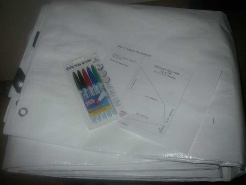 This pictorial shows the methods I use to actually sew the sail described in Designing a 76sqft Lug Sail. There are lots of ways to do this - please don't think I am telling anyone what to do, I'm just showing how I have done it. I have my tarp, some wet erase markers (wet erase is WAY easier to