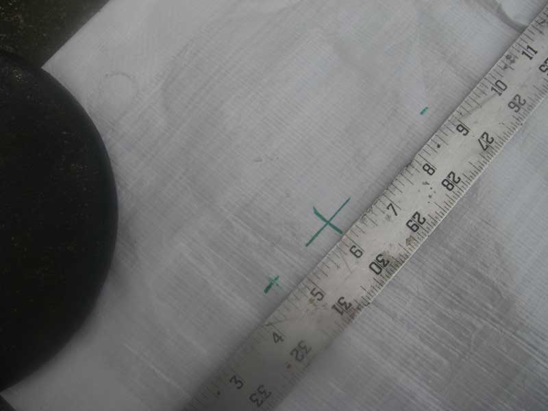 The leech of the sail is laid out along the long-way of the tarp. The first step is to make a reference point 6" in and 6" up from a corner. This corner will be the clew of the sail.